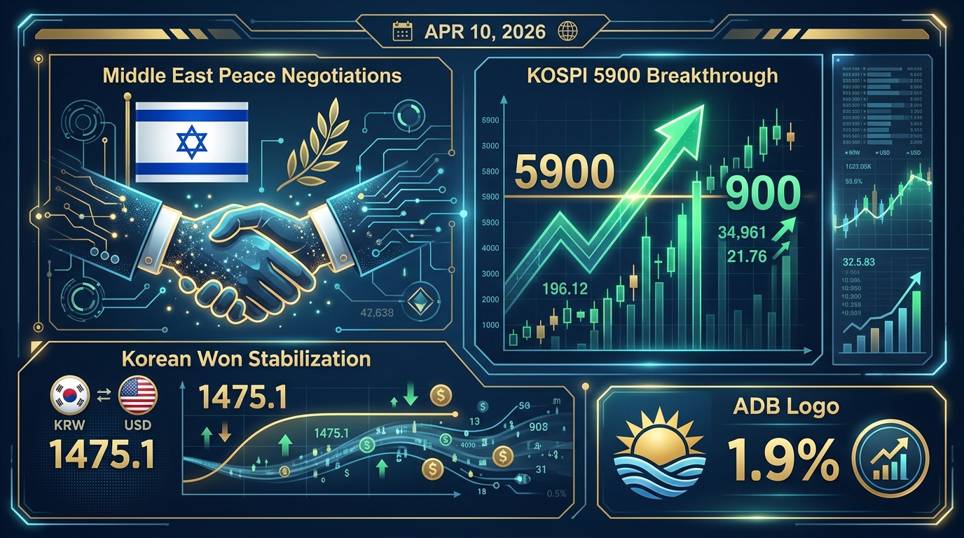 4월 10일 글로벌 금융시장은 중동발 지정학적 리스크의 완화와 한국 거시경제의 펀더멘털 개선 신호가 맞물리며 뚜렷한 위험자산 선호(Risk-On) 기조가 관찰됩니다. 코스피는 5,900선이라는 역사적 마디 지수를 향해 강한 모멘텀을 형성 중이며, 외환시장과 채권시장 역시 이러한 기류를 반영하여 프라이싱을 재조정하는 국면입니다. 아시아 지역을 향한 글로벌 자금의 포트폴리오 리밸런싱이 가속화되는 가운데, 주요 자산군별 핵심 프라이싱 동인과 전술적 시사점을 분석합니다.